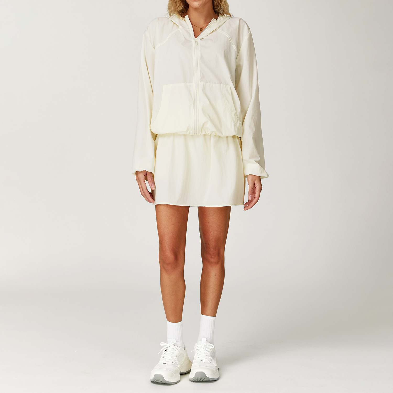 Crafted from a soft blend of nylon and spandex, this jacket set feels as good as it looks. Its slim, feminine silhouette flatters your shape without restricting movement. With a full-length zipper, hooded design, and convenient slash pockets, it combines functionality with a sleek, minimal style that fits seamlessly into your fitness and casual wardrobe.
