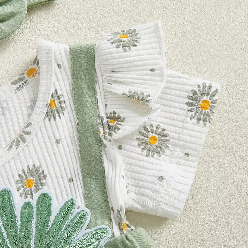 The daisy print embroidery adds a charming touch, while the patchwork design gives a trendy “two-piece” look with none of the fuss. Finished with short sleeves, ruffle accents, and a classic round neckline, this outfit ensures your little one looks adorable wherever she goes. Paired with a matching headband, it’s a picture-perfect ensemble made for moments you’ll want to capture.