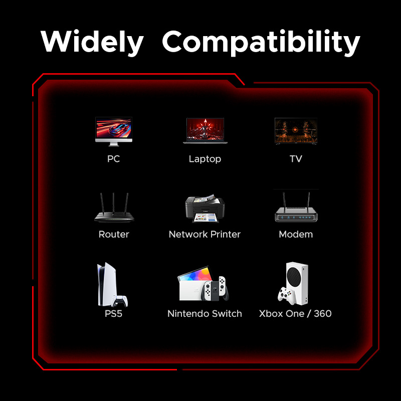 - Universal Compatibility: Works with all devices with RJ45 ports — including PS5, Xbox, PC, modem, router, and more.
