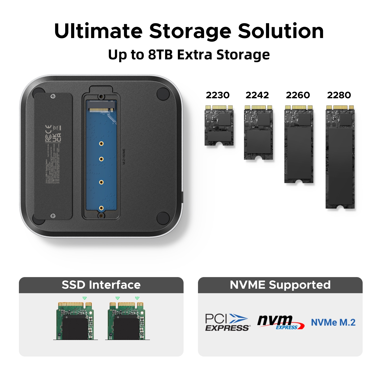 This 10-in-1 docking station is built to simplify and supercharge your workflow. It includes 4 USB-A 3.2 ports and 1 USB-C 3.2 port, all offering blazing-fast 10Gbps transfer speeds—perfect for managing high-volume files in seconds. A dedicated M.2 NVMe SSD slot supports up to 8TB of additional storage, giving you the space and speed needed for video editing, 3D rendering, and professional-grade media handling.