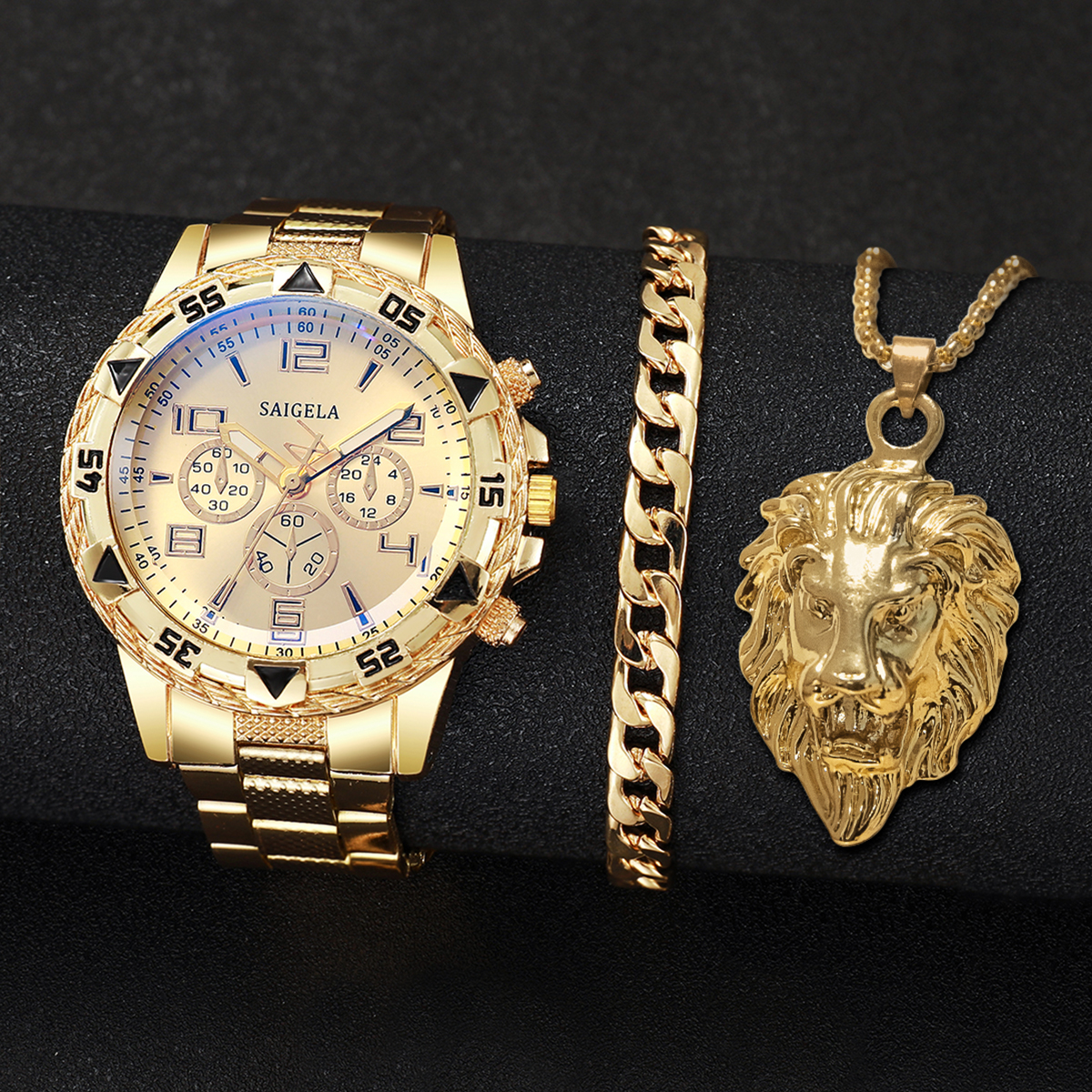 What a fantastic find! I've been on the lookout for something like this for quite some time. The watch, bracelet, and necklace combo is just perfect – each piece complements the other beautifully. It's clear that they're all made from durable alloy because even after daily use, they still look as polished and shiny as when I first got them. The quartz movement of the watch has proven to be incredibly reliable too; it keeps accurate time without needing much maintenance at all. Plus, the bold design really stands out – whether I'm in a business meeting or out on a date night with my wife. All in all, an excellent purchase.