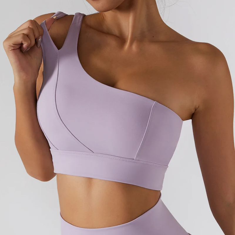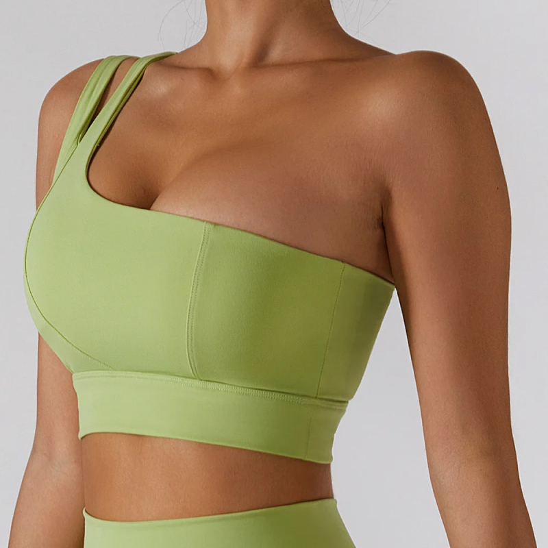 Let me tell you about this amazing piece of clothing I recently added to my fitness wardrobe This sports bra is unlike any other With its high-strength support, it gives me the confidence to take on more challenging workouts without worrying about discomfort or fit issues Then there's the push-up effect which enhances my shape in such a flattering way But perhaps what truly sets it apart is its bold one-shoulder design - effortlessly blending style with functionality Lastly, thanks to its sweat-wicking fabric, staying cool and dry during intense sessions has never been easier A true all-season companion indeed!