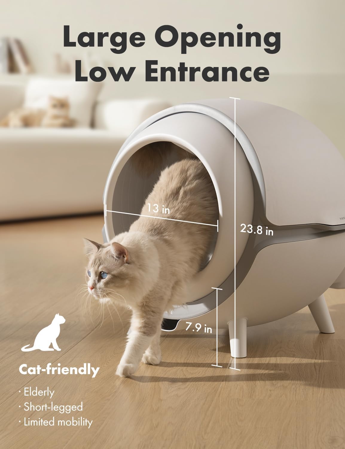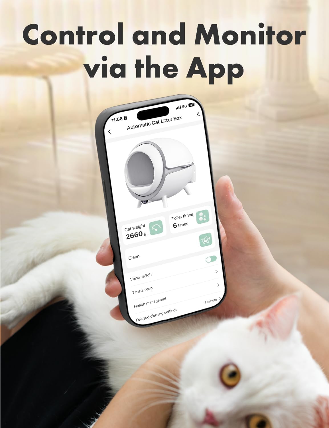 This litter box is perfect for cat owners who want a low-maintenance yet highly efficient solution for managing their pet’s hygiene. The smart design not only caters to your convenience but also prioritizes your cat’s safety and comfort. With app connectivity, you stay informed about your cat’s health and behavior, making it ideal for busy pet parents.