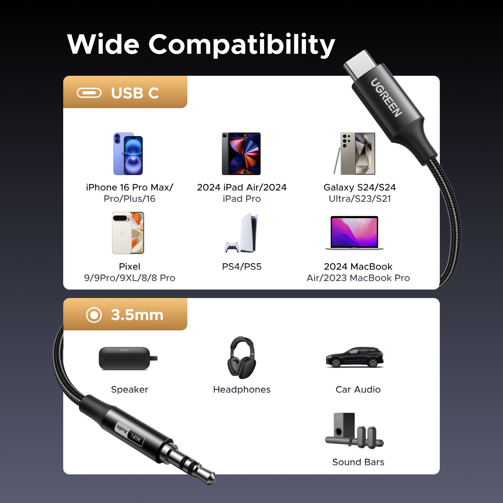 This adapter is perfect for everyday listening—whether you’re commuting, working out, gaming, or relaxing at home. It’s also ideal for cars that only support 3.5mm input, letting you connect your USB-C device to your vehicle’s sound system without hassle.