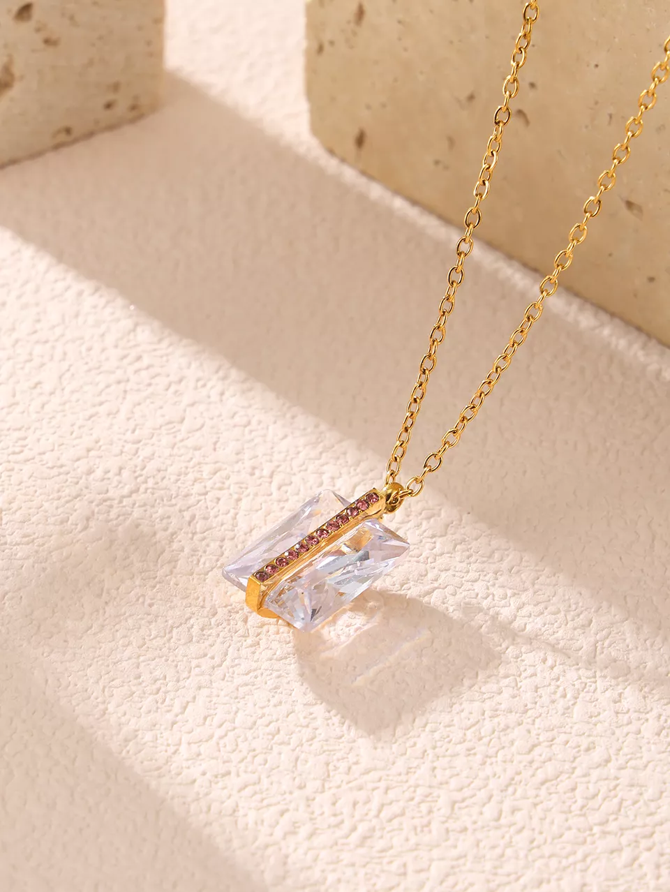 Made from high-quality stainless steel, this necklace is built to last. The rich 18K gold plating adds a luxurious shine while protecting it from fading and tarnish. The waterproof design means you can wear it confidently — rain or shine, at the beach or poolside — without worrying about damage. The standout feature, a large square-cut zircon pendant, reflects light beautifully, offering the brilliance of fine jewelry with the resilience of everyday wear. Its elegant chain design lays smoothly on the skin, ensuring all-day comfort.